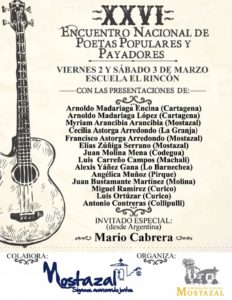 cón de la comuna de Mostazal, se llevó a cabo una nueva versión del encuentro de poetas populares y payadores más antiguo de Chile. En esta versión, la número 26, se contó con la presencia de más de 15 poetas populares, payadores y payadoras que se lucieron en el escenario participando en las múltiples dinámicas de la poesía improvisada, sin dejar de lado espacios para la presentación de versos hechos por diferentes fundamentos.